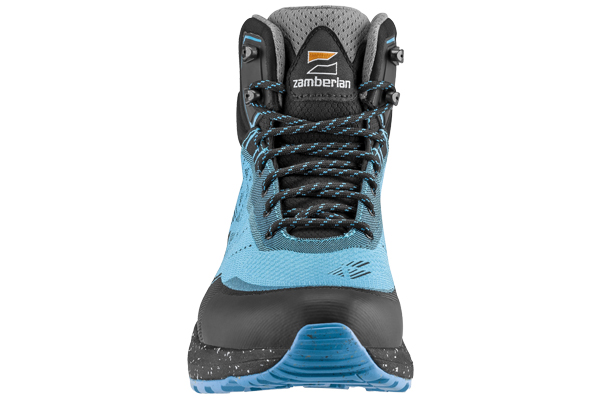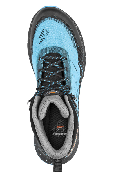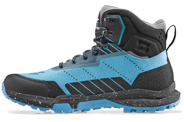 Das Obermaterial aus recyceltem Jacquard-Gewebe überzeugt durch Flexibilität und Widerstandsfähigkeit. Dank der reduzierten Nähte und gezielt eingesetzten abriebfesten Verstärkungen an stark beanspruchten Stellen bietet der Schuh eine lange Lebensdauer. In der Mid-Version mit 15 cm Schafthöhe sorgt der höhere, flexible Schaft für gezielten Halt im Knöchelbereich – besonders wichtig auf unebenem Gelände.
